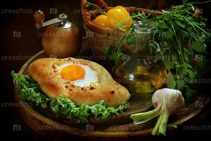 Хачапури по-аджарски на деревянном фоне