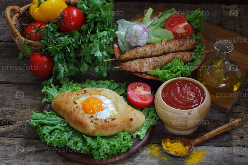 Хачапури по-аджарски с люля кебаб на деревянном фоне
