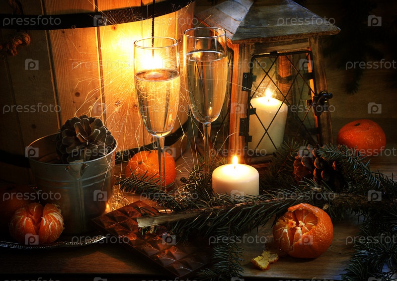 Новогодний натюрморт с шампанским и шоколадом