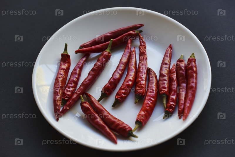 Горящий красный перец на белой тарелке. Острый перец крупным планом. Острая приправа