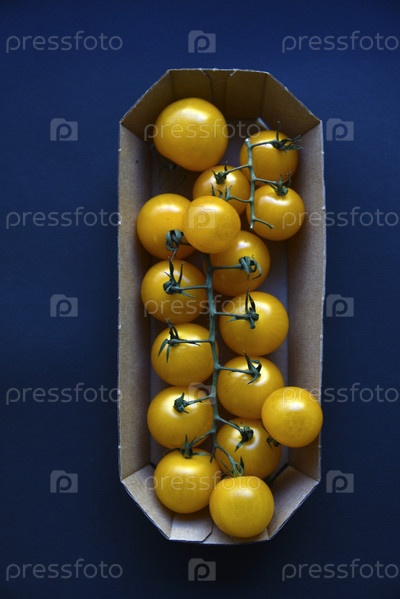 Маленькие помидоры черри желтые и красные в бумажном контейнере. Маленькие помидоры на черном фоне