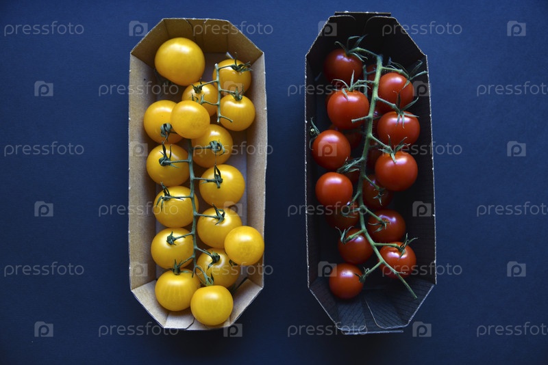 Маленькие помидоры черри желтые и красные в бумажном контейнере. Маленькие помидоры на черном фоне