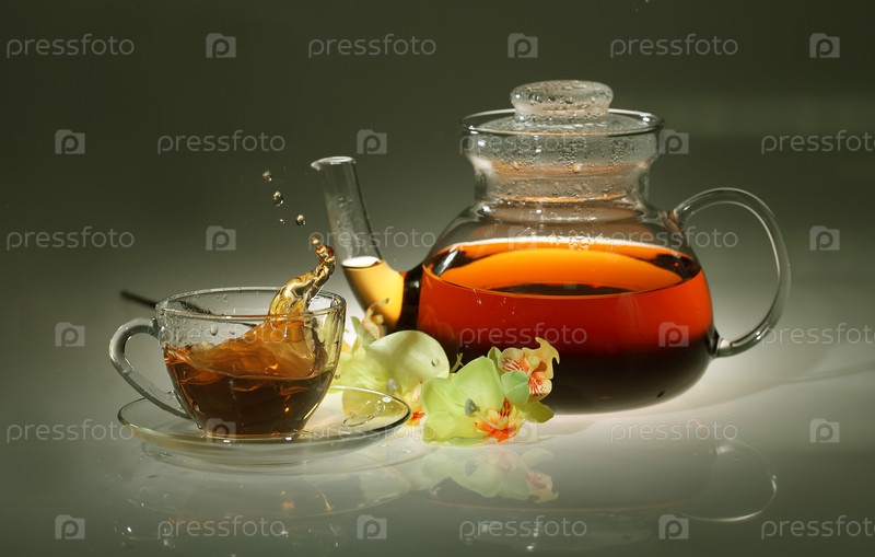 Цветочный чай в стеклянном чайнике и чашке