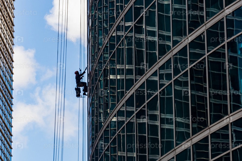 Промышленный альпинизм. Мойщик окон выполняет работу между двумя небоскребами