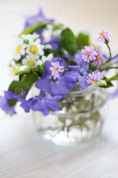 Букет с барвинком на белом деревянном фоне