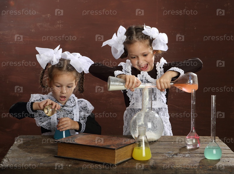 Две школьницы проводят химические эксперименты