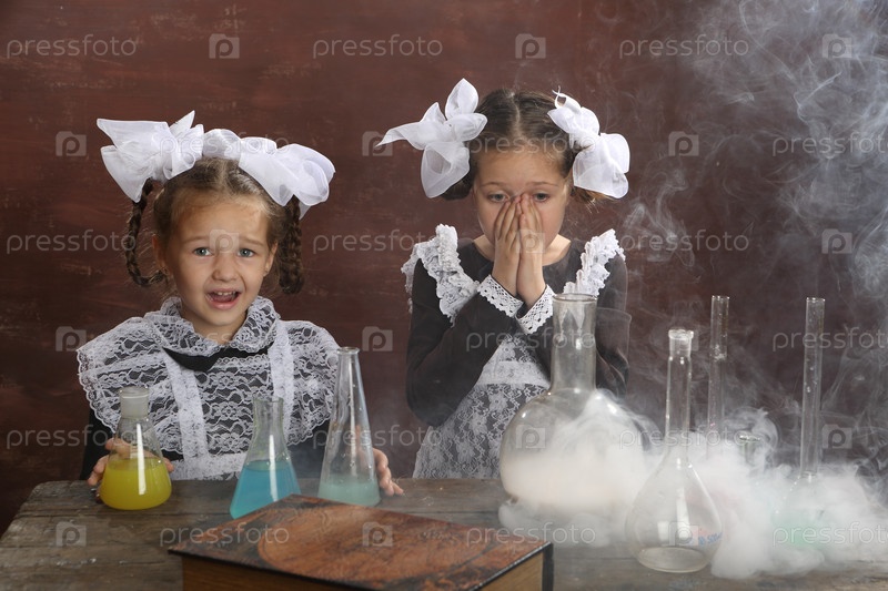 Две школьницы проводят химические эксперименты