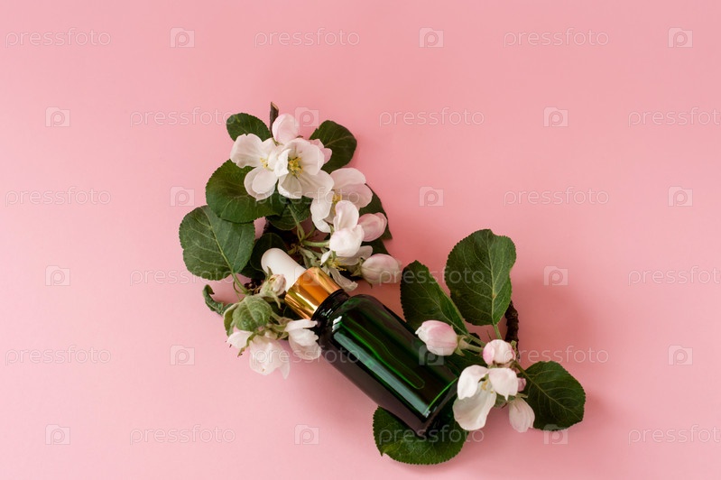 Натуральное эфирное масло для домашнего ухода за кожей. Розовые цветы яблока и косметическая стеклянная бутылка с капельницей для увлажняющей сыворотки, тонера для лица, очищения, снятия макияжа или лечения прыщей