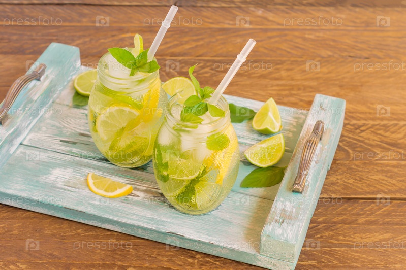 Летний свежий холодный лимонад с лаймом, лимоном, мятой и льдом подается на синем деревянном подносе. Безалкогольный напиток