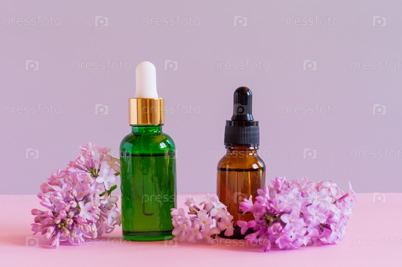 Макет стеклянных бутылок-капельниц на розовом фоне с сиреневыми цветами. Небрендированная косметическая пипетка-сыворотка