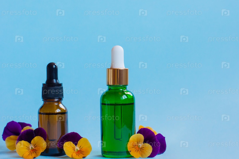 Стеклянные бутылки сыворотки с пипеткой и красивыми цветами альта на синем фоне. Натуральная органическая спа-косметика. Передний план