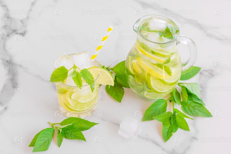 Летний освежающий детокс-коктейль. Вода с лимоном, мятой и льдом в банке каменщика на фоне белого мрамора. Деревенский стиль