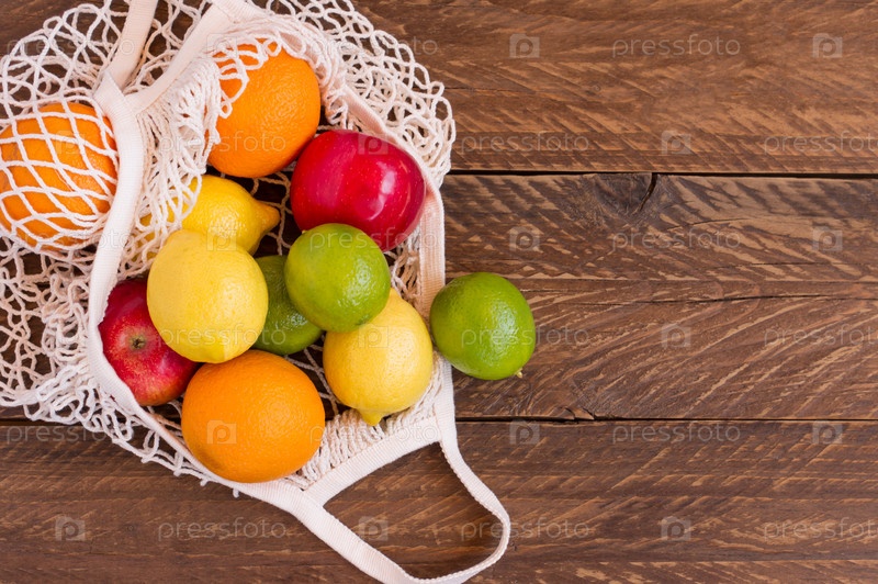 Органические фрукты в хлопчатобумажной сетке на деревянном столе, многоразовая сумка для покупок. концепция устойчивого образа жизни и нулевых отходов. Скопируйте место для текста