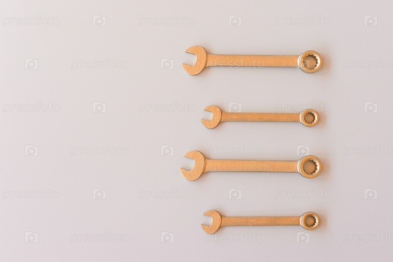 Новые гаечные ключи на сером фоне, вид сверху с местом для текста. профессиональные инструменты сантехника с крепежными болтами