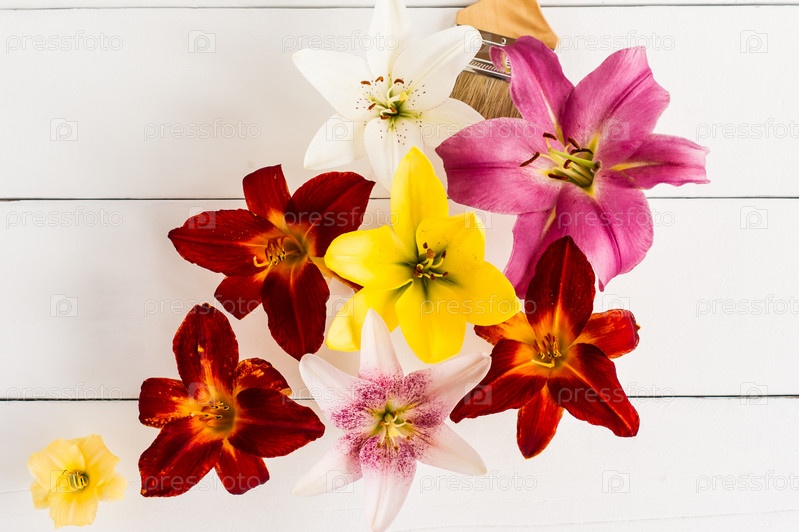 Цветочная креативная композиция. модель красивых лилий с кистью. концепция ярких красок