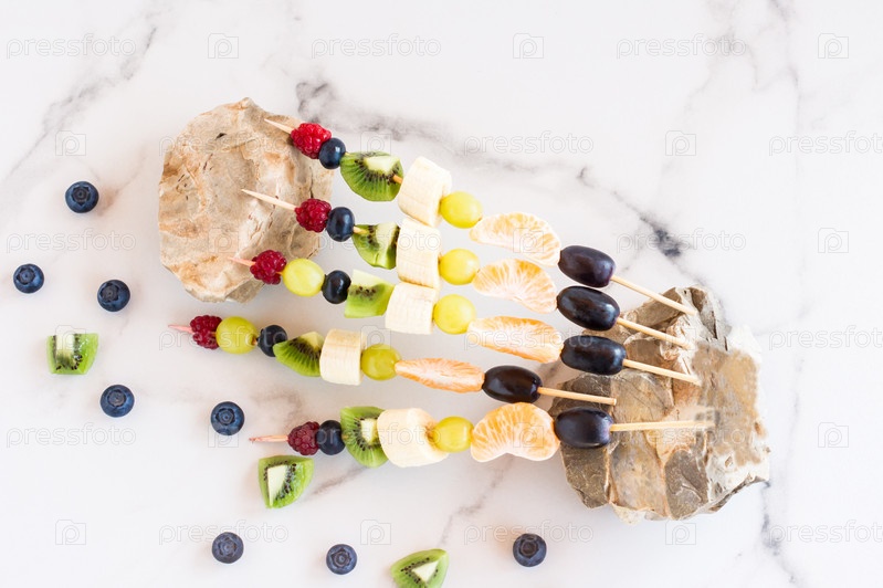 Канапе из сочных фруктов на камнях и мраморном столе. летняя композиция. здоровое питание