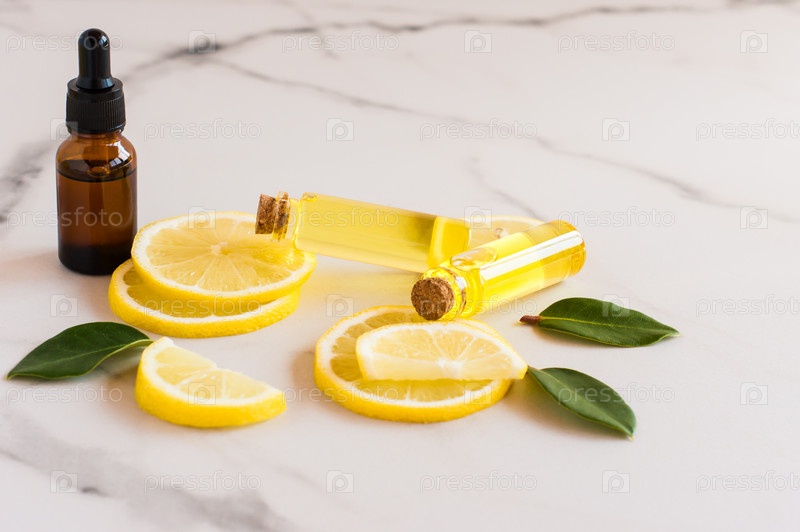 Сыворотка для ухода за кожей и эфирные масла лимона на мраморном столе. увлажнение, ароматерапия, антистрессовый эффект
