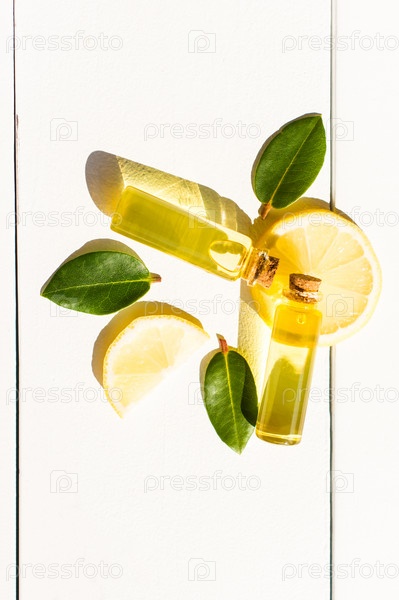 Концепция натурального органического эфирного масла лимона для ухода за собой. увлажнение, ароматерапия. вид сверху. красивые тени