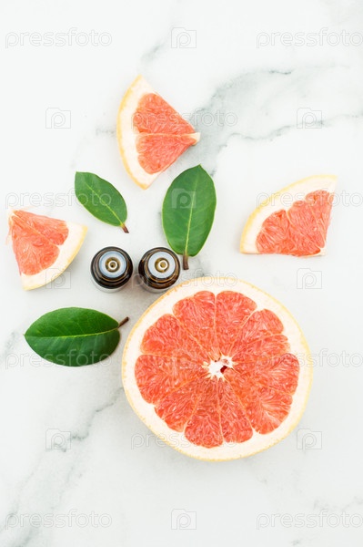 Эфирное масло грейпфрута в медицинских бутылках с капельницей на мраморном столе. вид сверху. сочные плоды грейпфрута