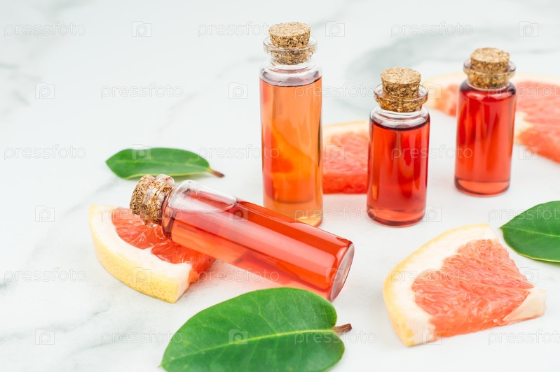 Стеклянные бутылки с пробковой крышкой с необходимой косметикой из плодов грейпфрута на мраморном столе