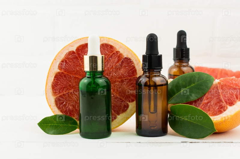 Три бутылки грейпфрутовой сыворотки на фоне спелых фруктов и листьев. омоложение кожи лица