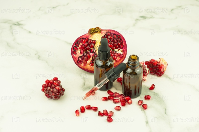 Увлажняющий масляный флюид для лица с экстрактом зерен граната на мраморном фоне и плодами граната