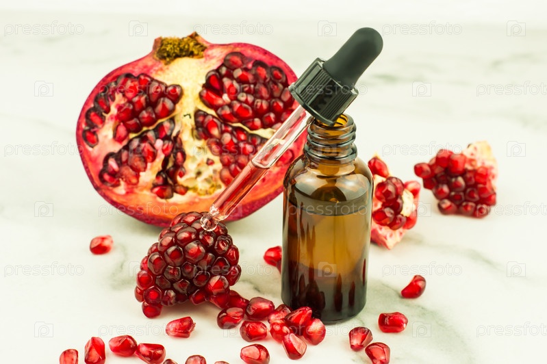 Косметическая бутылка с гранатовым маслом и капельница-капельница, наполненная маслом на фоне граната и зерен граната. крупный план