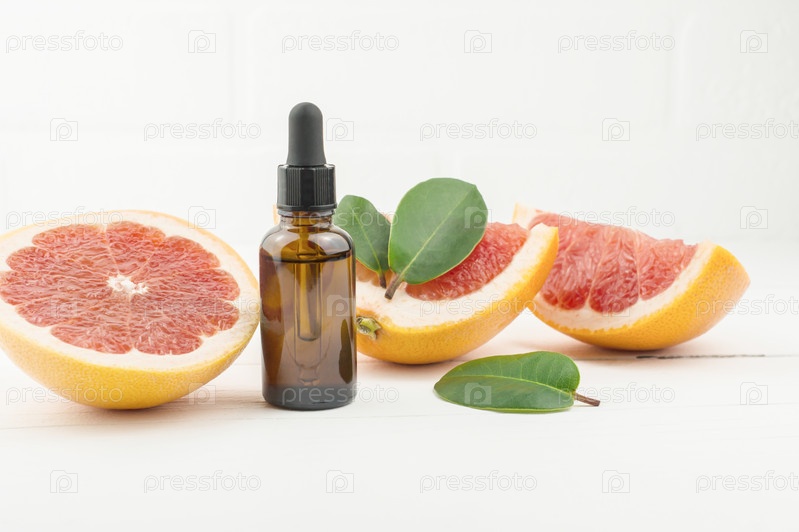 Сыворотка для лица в стеклянной бутылке с пипеткой, спелым грейпфрутом и ломтиками фруктов на белом деревянном фоне