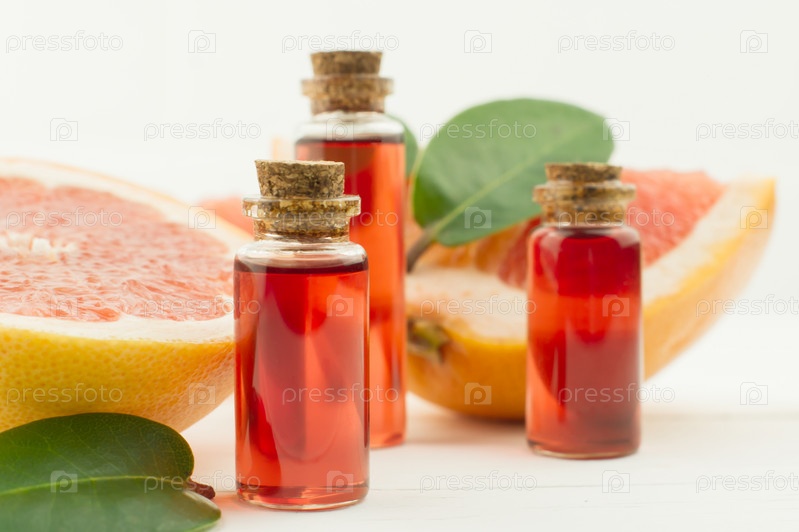 Эфирное ароматическое масло грейпфрута в трех флаконах с пробковой крышкой. спелые плоды и листья. белый фон