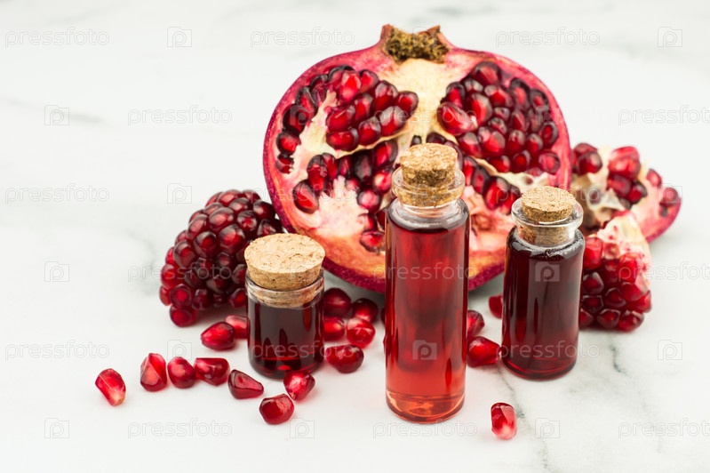 Бутылки эфирного масла и спелых плодов граната на мраморном фоне. концепция увлажнения, ароматерапии, антистрессового эффекта