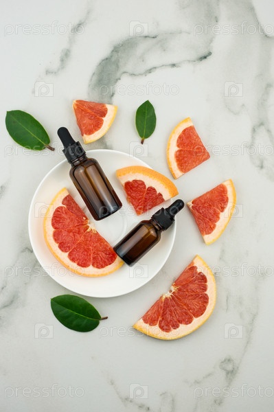 Грейпфрутовое масло в двух косметических флаконах на белой тарелке с кусочками фруктов. мраморный стол. вид сверху