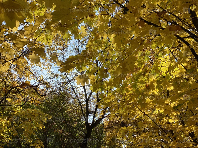 Желтые кленовые листья на дереве в сухой солнечный осенний день
