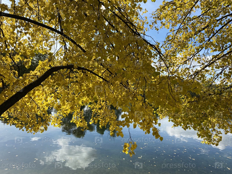 Желтые листья березы на дереве в сухой солнечный осенний день