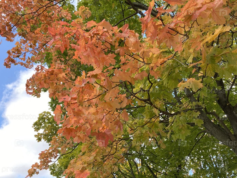 Желтые кленовые листы на дереве в сухую солнечную осень
