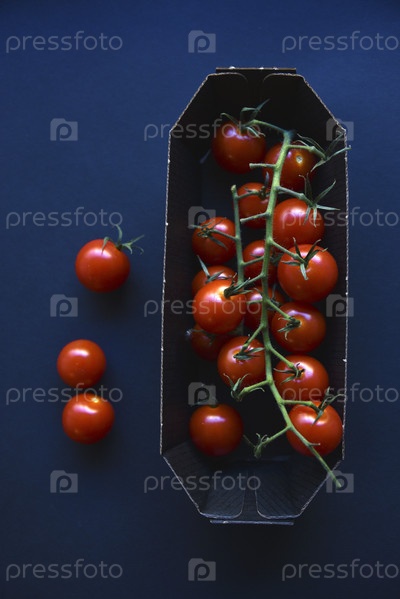 Маленькие помидоры черри желтые и красные в бумажном контейнере. Маленькие помидоры на черном фоне