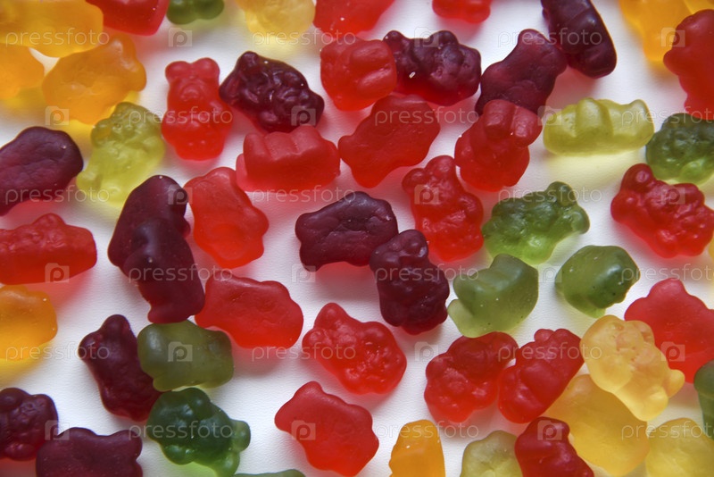 Красочные мармеладные мишки на белом фоне. Вкусные сладкие желейные конфеты с большим фоном