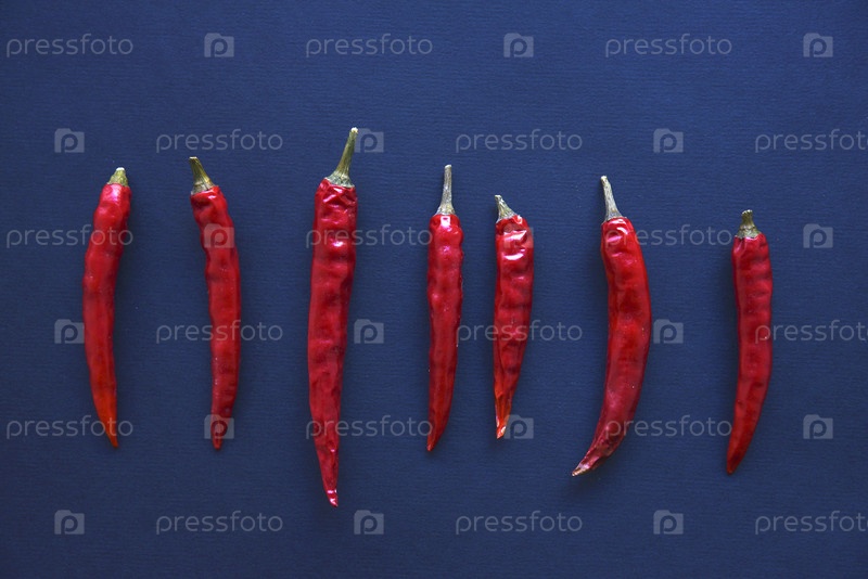 Красный острый стручковый перец на черном фоне. Крупный план специй. Капсикум в группе на заднем плане