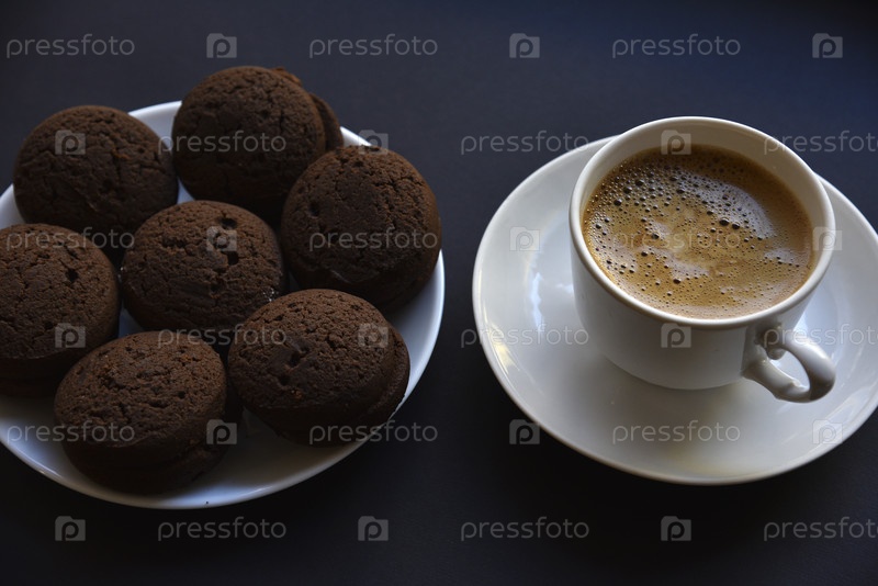 Вкусный черный кофе с пеной в белой чашке со сладким печеньем. Вкусный завтрак с кофе и печеньем. Сладкое и мягкое печенье на черном фоне