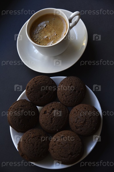 Вкусный черный кофе с пеной в белой чашке со сладким печеньем. Вкусный завтрак с кофе и печеньем. Сладкое и мягкое печенье на черном фоне