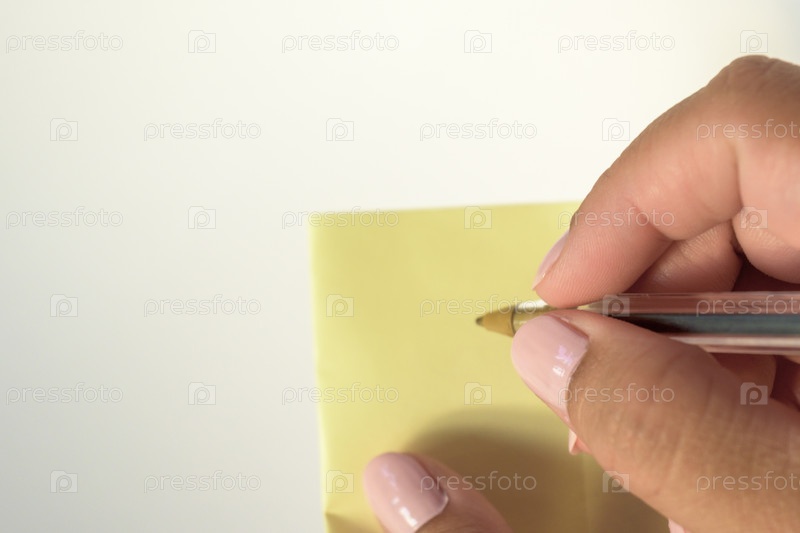Женская рука с накрашенными ногтями держит чистый лист бумаги на чистом белом фоне