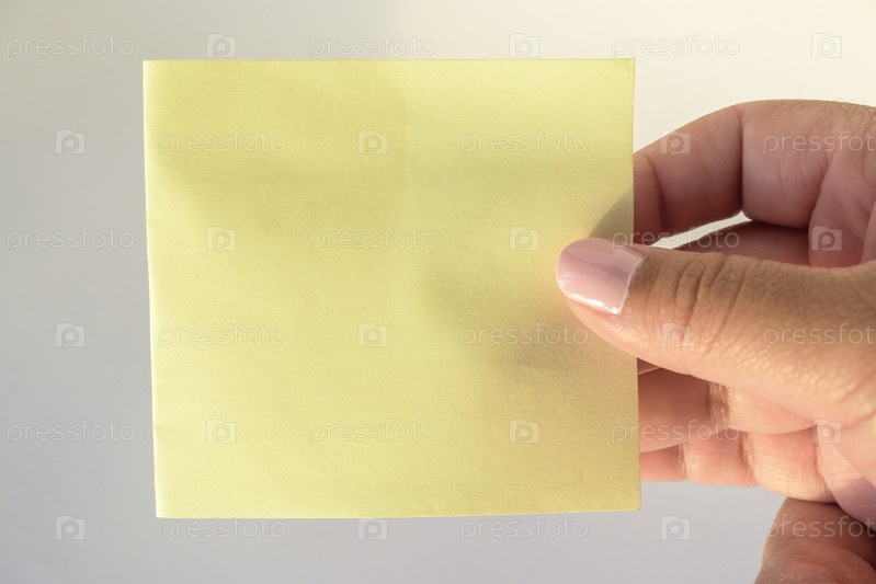 Женская рука с накрашенными ногтями держит чистый лист бумаги на чистом белом фоне