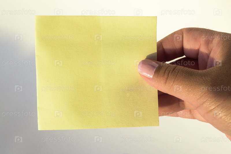 Женская рука с накрашенными ногтями держит чистый лист бумаги на чистом белом фоне