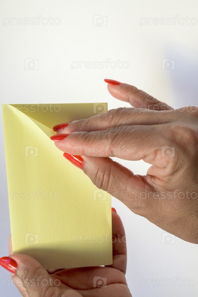 Женская рука с накрашенными ногтями держит чистый лист бумаги на чистом белом фоне
