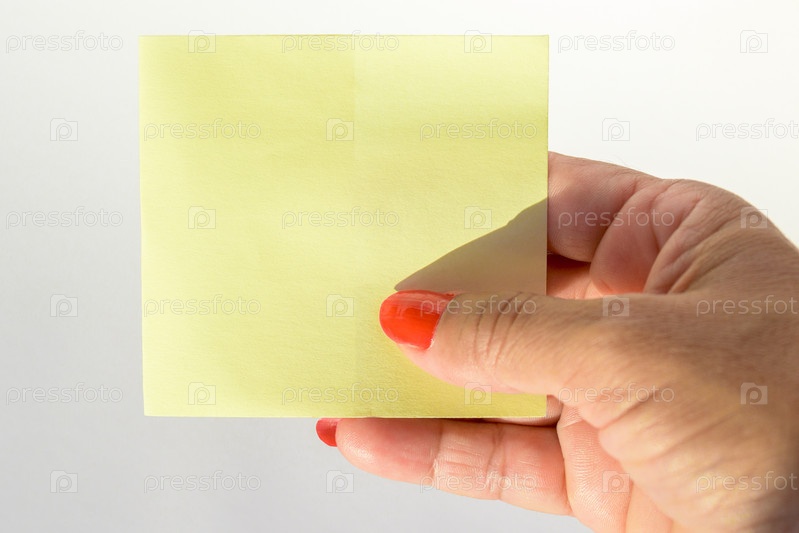 Женская рука с накрашенными ногтями держит чистый лист бумаги на чистом белом фоне