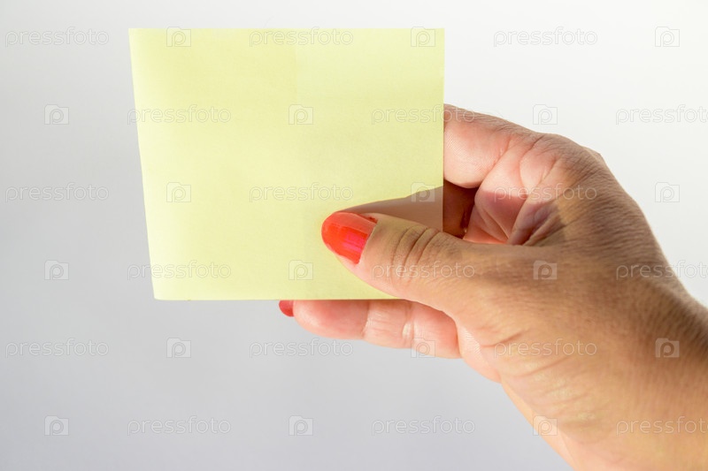 Женская рука с накрашенными ногтями держит чистый лист бумаги на чистом белом фоне