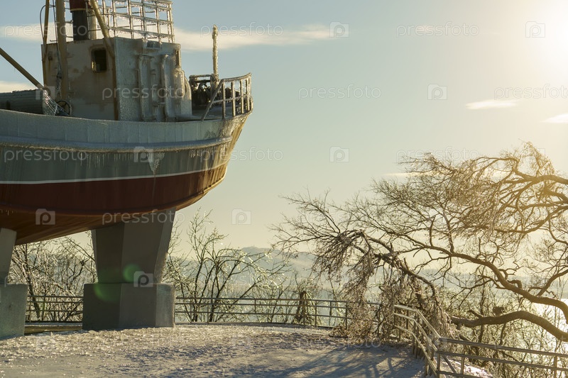 Владивосток, Россия 23 ноября 2020 г.: Городской пейзаж с видом на памятник морякам в виде катера