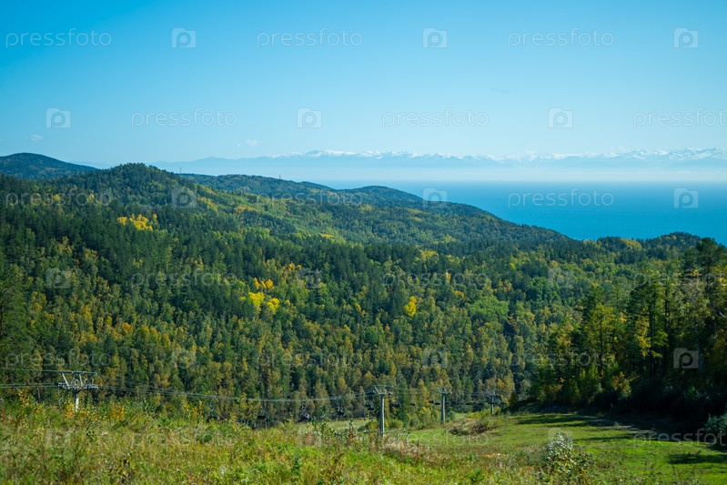 Пейзаж с видом на канатную дорогу и озеро Байкал