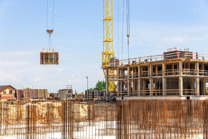 Кран и строительная площадка против голубого неба. Строящееся бетонное здание. На переднем плане стальная арматура фундамента будущего здания