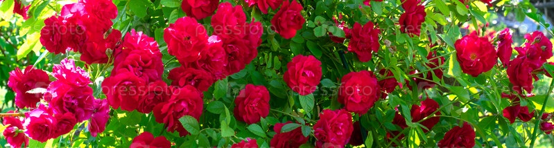 Веб-баннер с красной плетистой розой, цветущей гроздьями