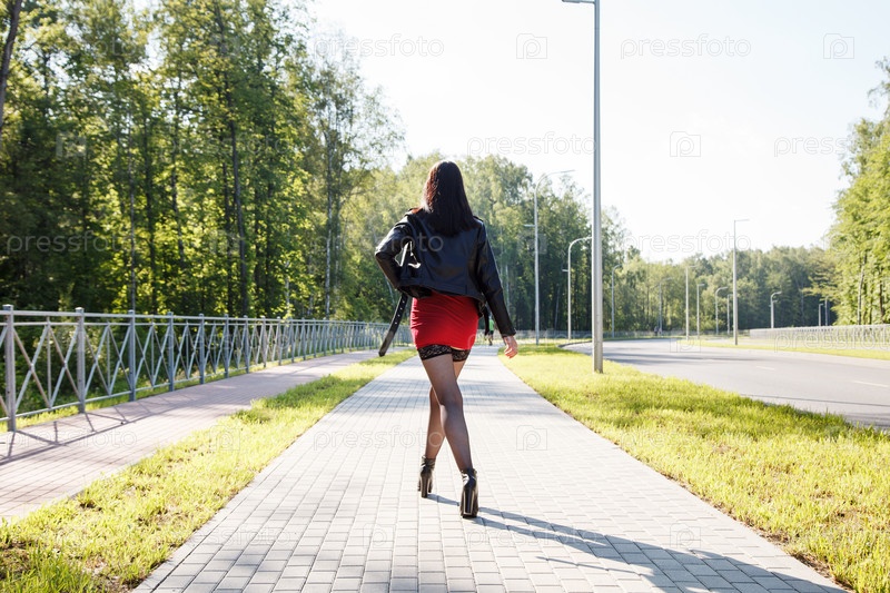 Молодая брюнетка в красном платье гуляет по аллее в парке в солнечный летний день. вид сзади